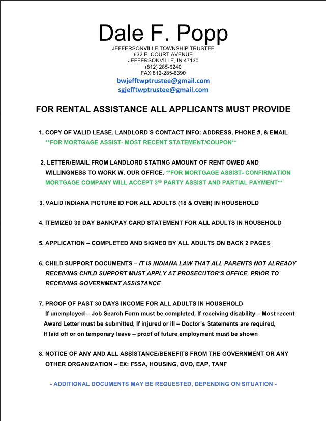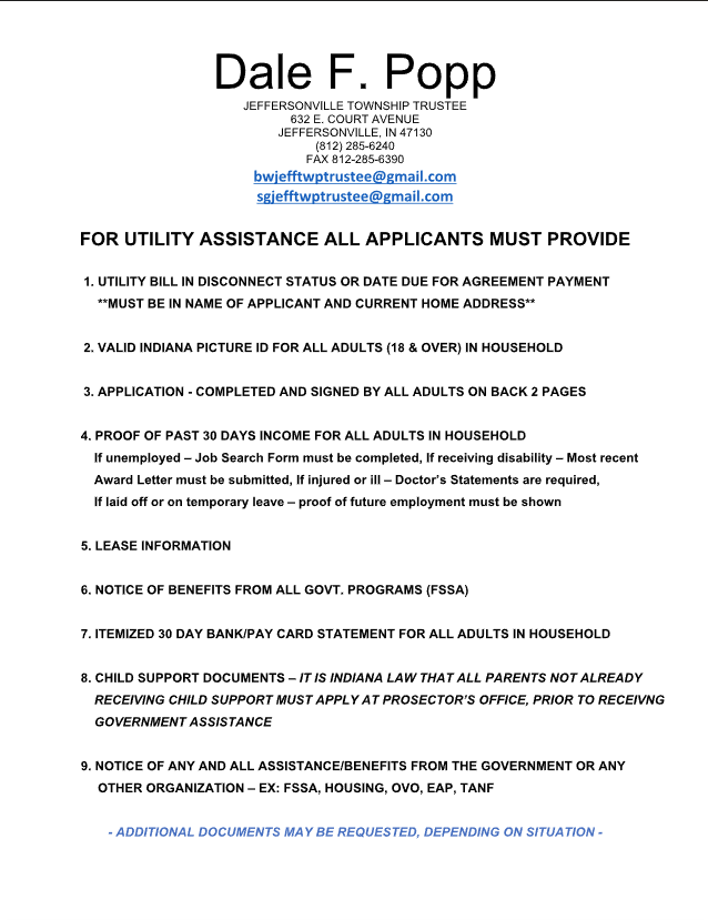 In order to receive assistance from the Jeffersonville Township Trustee, the following requirements must be met:
